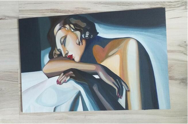 Wymiary: 35 na 55 cm Obraz ręcznie malowany na desce- farbami olejnymi. Interpretacja obrazu Tamary Łempickiej: Śpiąca.
